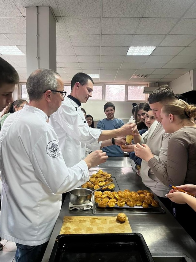 - Тука се извршува училишната пракса каде што учениците практично изведуваат вежби, учат техники од областа на готварството, слаткарството, пекарството, месарството, агенциското и хотелското работење и послужувањето. Во училиштето имаме занимања од тригодишното образование, и тоа: готвачи, слаткари, келнери, пекари, месари и четиригодишно образование и тоа: угостителски техничари, хотелско-туристички техничар, техничар за анимации и настани и хотелско-ресторански техничар. Учениците учествуваат и во реалниот сектор со извршување практична настава согласно наставната програма, и тоа во угостителско-туристички објекти во градот, во државата и во странство. Училиштето предвидува редовна пракса во текот на наставната година, феријална пракса во текот на летото. Посебно морам да ги нагласам теоретските предмети во кои се посветува големо внимание на секој ученик. Училиштето работи на проекти, на пример, проектот за меѓуетничка интеграција и образование, проекти според Еразмус програмите, посебни образовни програми за лица со попреченост според програмите за инклузија и друго - ни споделува Дејан.