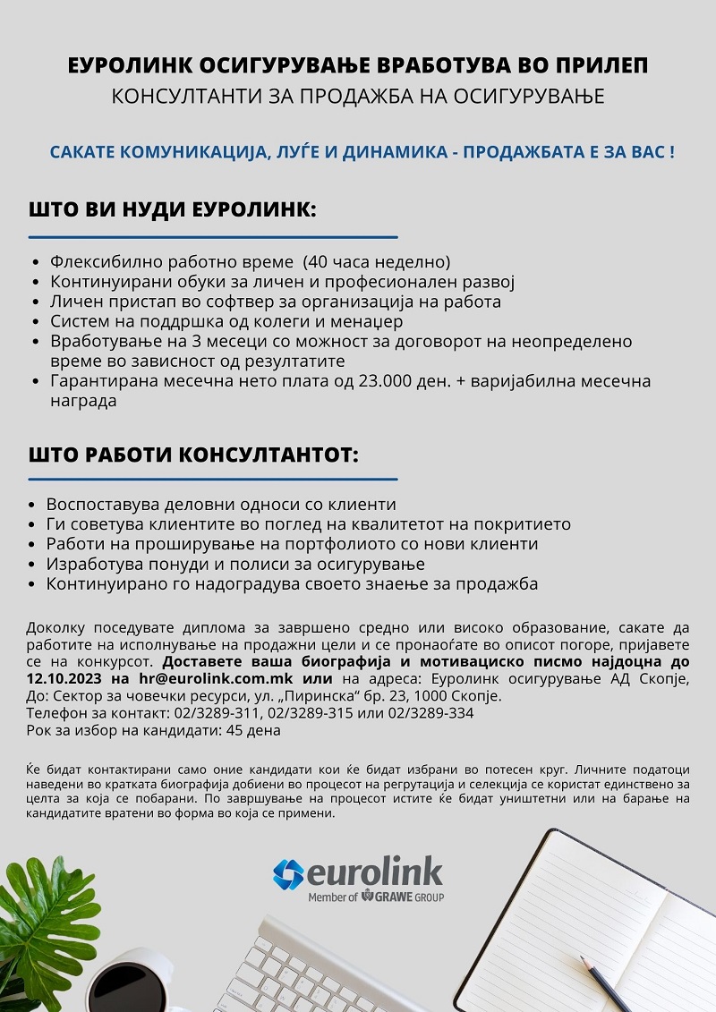 Еуролинк вработува консултанти за продажба на осигурување (Прилеп)
