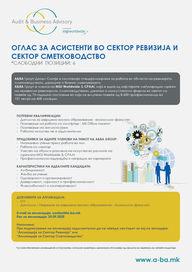 Оглас за вработување асистенти во сектор ревизија и сектор сметководство