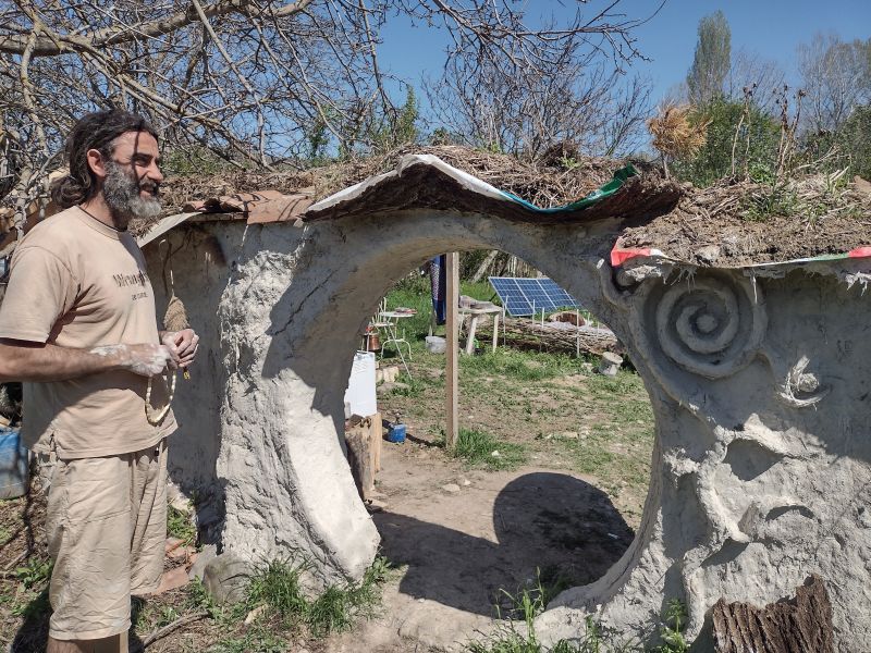 А, на неколку стотици метри пред некогашната „Порцеланка“, меѓу грмушките ѕиркаат куќичките со заоблен покрив слични на сцените од филмот „Хобит“, кои Димче ги изградил од камен, кал и слама. Меѓу нив веднаш се чувствува енергијата што тој постојано ја потенцира при своите обуки за градба на кои досега учествувале стотина луѓе.