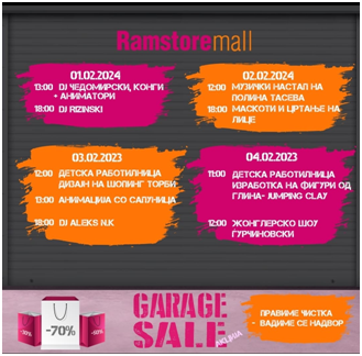 Покрај големите попусти, посетителите на „Рамстор мол“ ќе може да уживаат во богатата програма специјално организирана за овој настан, која содржи многу музика во придружба на добро познатите диџеи ЧЕДОМИРСКИ, КОНГИ кои свечено ќе го одбележат стартот на најголемата распродажба во градот Garage Sale.