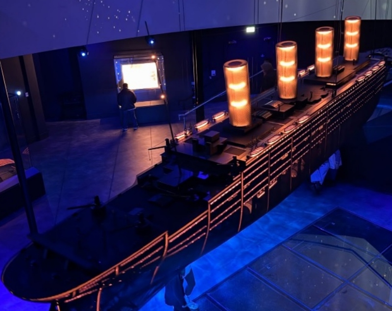 Вниманието е насочено и на раскошниот ентериер на „Титаник“, животите на неговите патници и настаните што воделе до судбоносното патување на бродот. Еден од најимпресивните елементи е големата просторија со видеопроекции во стилот на панорамски приказ. Таму посетителите можат виртуелно да се прошетаат низ луксузните палуби на бродот - од кабините од прва класа до величественото скалиште.
