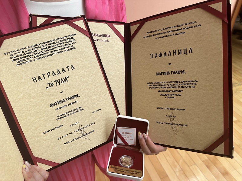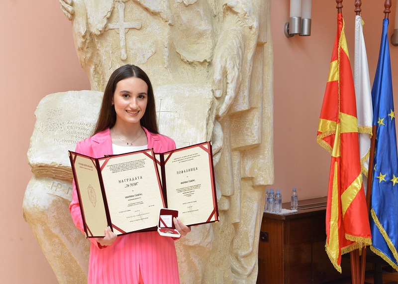 Марина Главче, која дипломира на Економски факултет при Универзитетот „Свети Кирил и Методиј“ со просек 9,78, е дел од студентите што ја добија наградата за најдобар студент за 2021/2022, како и наградата „26 Јули“, која им се доделува на најдобрите студенти од сите факултети.