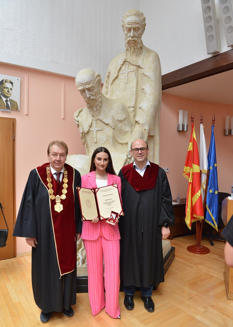 - Да се биде меѓу најдобрите, за нијанса издвоен од другите студенти, претставува чест и задоволство, особено кога признанието е оддадено од страна на најстариот и најголемиот универзитет во Македонија - УКИМ. Станува потсетник дека трудот, упорноста и ангажираноста се вреднуваат и уште повеќе носи мотив за нови хоризонти и достигнувања - вели таа.