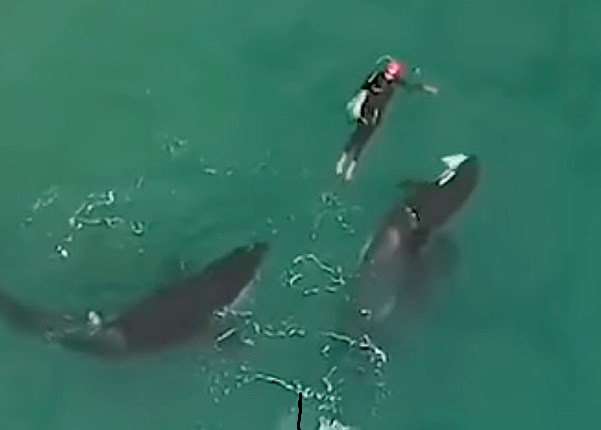 На жената од видеото во пливањето ѝ се придружија група китови, а тоа истовремено е страшно и величествено.