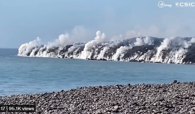 По контактот со Атлантскиот Океан, лавата, која има температура од околу 1.000 Целзиусови степени, почнала да се скаменува и веќе формирала мал полуостров широк околу 500 метри, кој се гледа во видео објавено на „Твитер“ од истражувачкиот институт ЦСИЦ.