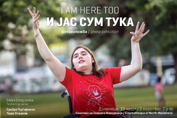 Во рамките на фестивалот за литература и илустрација за деца „Литера“, утревечер (19 ч.) во холот на Кинотеката ќе биде отворена изложбата на фотопортрети „И јас сум тука“, која ќе биде посветена на 20 лица со интелектуална попреченост од повеќе градови од Македонија на различна возраст. Автор на фотографиите е Тоше Огњанов, а на приказните Сребра Ѓорѓијевска. Идејата е да се раскажат 20 приказни преку фотографија и текст.