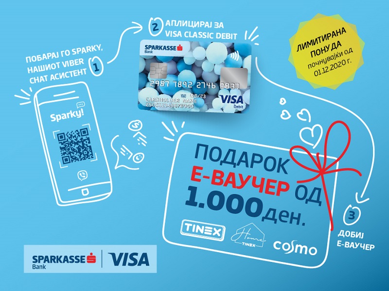 Во духот на новогодишните и божиќните празници што нѐ очекуваат, Шпаркасе банка Македонија започнува нова промотивна кампања наградувајќи ги сите нови корисници на VISA Classic Debit со вредносен ваучер во износ од 1.000 денари.
