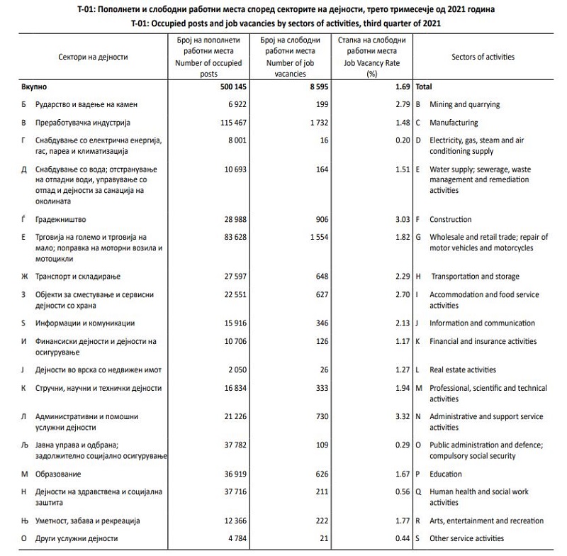 Според податоците на ДЗС, вкупниот број на пополнети работни места во третото тримесечје од годинава е 500.145, од кои најмногу се во преработувачката индустрија (115.467), а потоа следува секторот трговија на големо и трговија на мало, поправка на моторни возила и мотоцикли (83.628), јавна управа и одбрана, задолжително социјално осигурување (37.782), дејности на здравствена и социјална заштита (37.716) итн. Најмал број пополнети работни места има во секторот дејности во врска со недвижен имот, 2.050, но таму има и мал број слободни работни места (26).