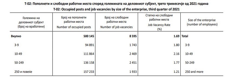 Деловните субјекти со број на вработени од 10 до 49 имаат највисока стапка на слободни работни места која изнесува 2,16%,се наведува во соопштението на ДЗС.