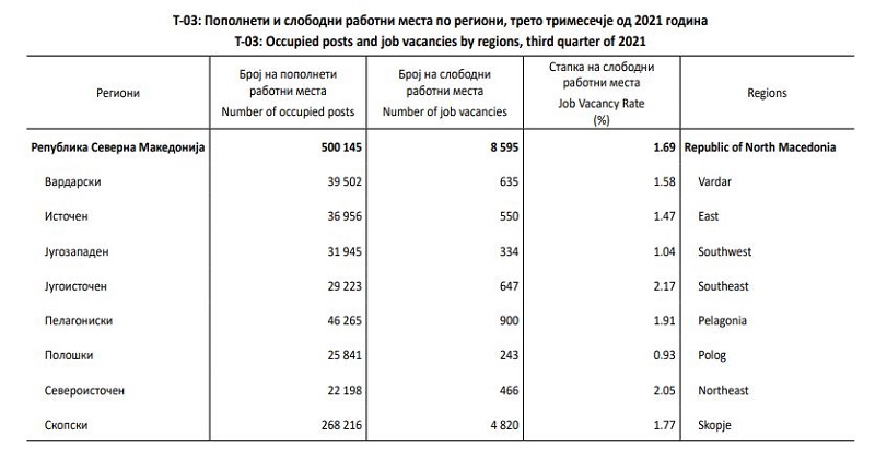 Оттаму додаваат дека највисока стапка на слободни работни места има Југоисточниот Регион со 2,17%, односно вкупно 647 слободни работни места. Анализата на податоците на пополнети и слободни работни места според региони покажува дека најголема концентрација на работна сила има во Скопскиот Регион, каде што има 268.216 пополнети и 4.820 слободни работни места.