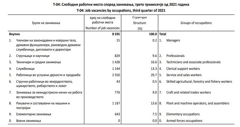 Стапката на слободни работни места во третото тримесечје од 2021 година изнесува 1,69%, покажуваат податоците на Државниот завод за статистика.