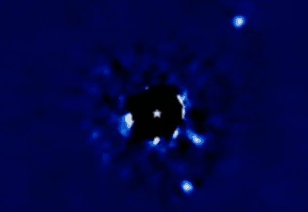 Четирите точки се егзопланети, а црниот диск ја затскрива нивната ѕвезда, оддалечена 133,3 светлосни години од Земјата. Парцијалните кругови се нивните орбитални движења, тајмлепс составен од 12-годишни набљудувања.