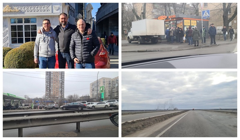 - Вкупно 4,5 часа ни беа потребни за да излеземе само од Киев поради големите колони. Користевме ГПС за да избегнеме долги колони и сè одеше супер, до еден момент кога снема интернет и буквално не знаевме веќе каде да одиме. Се слушавме со колега во Романија кој нè чекаше, па со негова помош ја сменивме маршрутата. Се упативме на еден граничен премин кон Романија кој беше спорадичен. Заглавивме во колона од 10 км бидејќи никој не знаеше каде оди, оти немаше интернет. Она што е карактеристично за Украинците е што се многу послушни и принципиелни, смирени се, следат правила. Имаше колона од 10 километри во три редици во само еден правец, а само еден ред беше ослободен за возилата од спротивниот правец. И никој не одеше во спротивниот правец за да пресекува, туку сите стоеја и чекаа дисциплинирано во колоната.