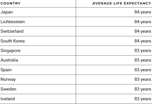 Земјите со најдолг очекуван животен век се богатите земји во Азија и Европа, а Јапонија, Лихтенштајн, Швајцарија и Јужна Кореја се на врвот на листата со 84 години.