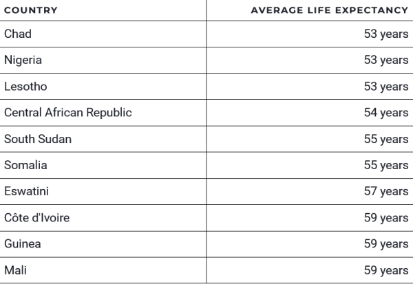 Спротивно на тоа, африканските нации Чад, Нигерија и Лесото имаат очекуван животен век од 53 години, најнизок меѓу сите земји.
