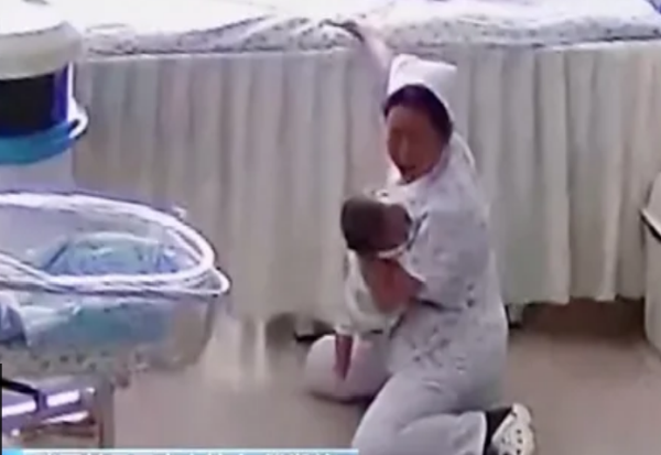 Видеоснимката од болницата прикажува една сестра како лежи на подот цврсто гушкајќи едно бебе, додека друга се обидува со рака да задржи повеќе креветчиња во кои биле сместени новороденчињата.