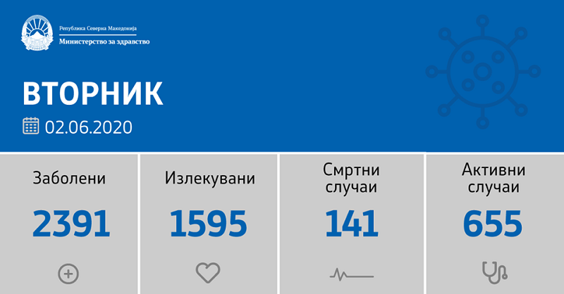 Во ГОБ „8 Септември“ починала пациентка од Струга (56 г.) примена во болницата на 21 мај како сомнителна на ковид, потврдена позитивна по прием во болница. Досега во земјава се направени вкупно 31.187 тестирања на Ковид -19. Вкупната бројка на дијагностицирани од почетокот на епидемијата изнесува 2.391, од кои оздравеле 1.595 пациенти, починале 141, а во моментов бројот има 655 активни случаи.