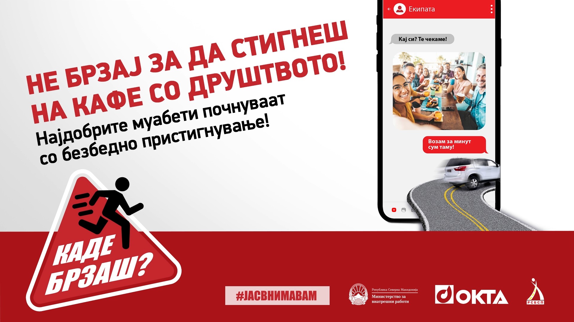 Под мотото „Каде брзаш? Не брзај за да стигнеш!“ стартува кампањата за безбедност во сообраќајот на ОКТА, Министерството за внатрешни работи (МВР) и Републичкиот совет за безбедност во сообраќајот на патиштата (РСБСП). Целта на кампањата е подигнување на свеста во јавноста за важноста на поголемото внимание на сите учесници во сообраќајот. Во рамките на кампањата ќе бидат преземени низа активности кои на иновативен начин ќе информираат, едуцираат и ќе алармираат за поголема одговорност во сообраќајот.