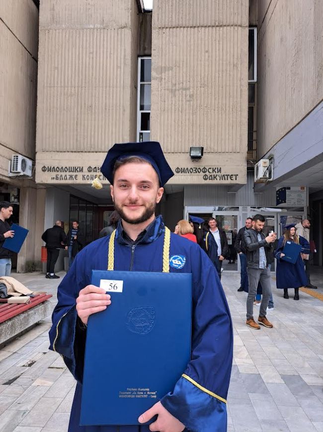 - Најпрво станав студент на Економскиот факултет во 2017 година, а во 2020 година паралелно се запишав и на Институтот за историја на Филозофскиот факултет - Скопје. Во 2021 година дипломирав на Економски и веднаш започнав со магистерски студии на истиот факултет. На Филозофски факултет дипломирав во 2023 година, за три наместо за предвидените четири години со просек 10 и веднаш потоа се запишав и на магистерски студии на овој факултет - вели Бужаровски.