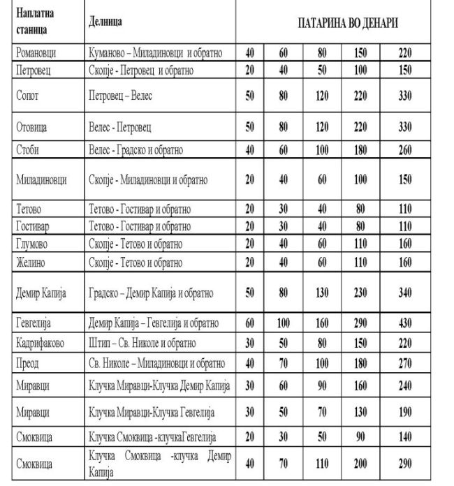- Патувам од Велес кон Скопје секој работен во текот на цела година. Месечно мене и сограѓаните што патуваат кон Скопје патарините нѐ чинат 85 евра, а годишно 1.030 евра. Тоа се три и пол минимални плати. Прескапи се патарините, а возиме по лоши автопати без добро осветлување и делници кои немаат ниту трета лента за принудно застанување. Во Бугарија можам да возам цел месец за 900 денари, во Романија цела недела возам за 180 денари, во Словенија една недела ме чини 15 евра, а во Австрија треба да платам десет евра за десет дена. На делницата Велес - Скопје со оваа сума од 10 евра можам да возам само два дена. Со картичките со надополнување средства постои попуст, но морам да внесам огромна сума на пари за цела година, а тоа не го прави никој освен фирмите што вршат транспорт на стока и на патници со камиони, односно автобуси – изјави патник од Велес кој секојдневно доаѓа на работа во Скопје.
