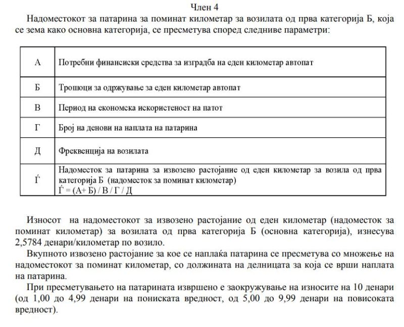 - Износот на надоместокот за извозено растојание од еден километар (надоместок за поминат километар) за возилата од прва категорија Б (основна категорија), изнесува 2,5784 денари/километар по возило. Вкупното извозено растојание за кое се наплаќа патарина се пресметува со множење на надоместокот за поминат километар со должината на делницата за која се врши наплата на патарина - стои во владината уредба.