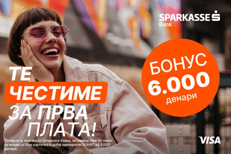 „Те честиме за прва плата“, сите млади на возраст од 18 до 25 години што ќе ја префрлат својата плата во Шпаркасе банка, ќе добијат еднократен бонус од 6.000 денари на својата Vibe On сметка.