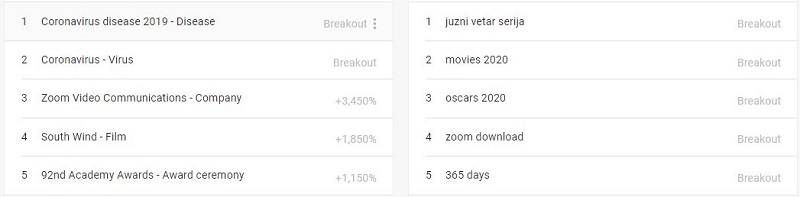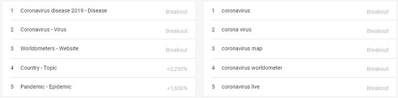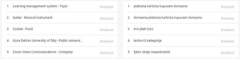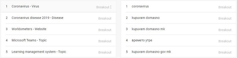 сите категории, каде што најпребарувана тема е „Coronavirus - Virus“, по што следуваат „Coronavirus disease 2019 - Disease“, „Worldometers - Website“ (страницата на која има статистички податоци за заболени, починати и оздравени од коронавирус за сите земји во светот), „Microsoft Teams“ (платформа за комуникација) и „Learning management system“.