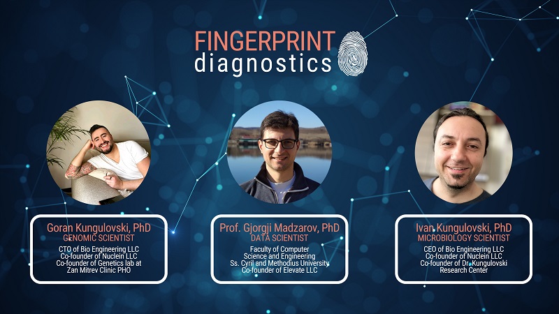 За развивање на концептот беа потребни околу 10 години подготовка, следење најнови технологии и читање научна литература. Откако утврдивме дека епигенетските техники и вештачката интелигенција достигнаа задоволително ниво на зрелост, започнавме со истражувањата во првиот квартал на 2022 година и ни беа потребни околу 18 месеци за да ги добиеме првичните резултати и научно докажување на концептот во наши раце. Fingerprint Diagnostics е компанија чиј примарен фокус е раната детекција на болести и со тоа минимизирање на човечкото страдање. Тимот се состои од д-р Горан Кунгуловски, проф. д-р Ѓорѓи Маџаров и д-р Иван Кунгуловски, урамнотеженa мешавина на искусни научници и претприемачи кои имаат дадено значаен научен придонес во полињата на персонализирана генетика, епигенетика, машинско учење и вештачка интелигенција и микробиологија, но исто така имаат соработувано со болници, европски влади, НАТО, европски универзитети, корпорации и ИТ-компании.