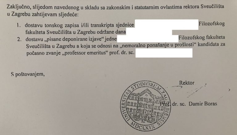 Хрватското високо образование го тресе скандал откако тамошните медиуми објавија дека ректорот на Универзитетот во Загреб, Дамир Борас, добил потпишана изјава за сексуално вознемирување од некогашна студентка на Филозофскиот факултет, но не започнал никаква постапка против обвинетиот професор, туку го наградил.