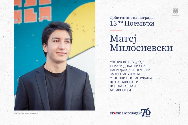 Би рекол дека мојата најсилна страна е самодисциплината. Никогаш во животот нема да имаме време да постигнеме сè што сме наумиле. Мислам дека ние, младите, имаме бесконечен потенцијал. Разликата е во тоа колку и за кои цели ќе го искористиме, вели средношколецот Матеј Милосиевски