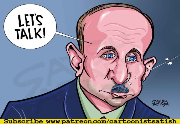 Сатиш Ахариа, популарен индиски карикатурист, илустрирал скица на која е прикажан Путин со мустаќите на Хитлер. „Ајде да разговараме“, вели Путин, иако муниција му излегува од носот наместо воздух.