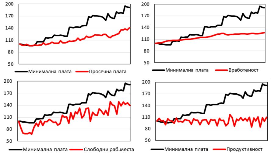 Во периодот 2012-2024 година вработеноста во Македонија континуирано расте, а истото може да се забележи и во однос на слободните работни места. Оттука, може да се заклучи дека порастот на минималната плата во изминатиот период нема изразени негативни ефекти врз вработеноста. Освен тоа, порастот на минималната плата во извесна мера повлекува зголемување на платите и кај повисоко платените работници. Продуктивноста на трудот во периодот 2012-2024 со извесни осцилации останува скоро непроменета, што може да претставува потенцијална опасност во однос на конкурентноста на македонските компании во услови кога платите континуирано растат. Сепак, оваа констатација не може да се генерализира за сите дејности, со оглед на тоа што секторите на ИКТ и финансии имаат значително поголема продуктивност споредена со земјоделство, градежништво и преработувачка индустрија.
