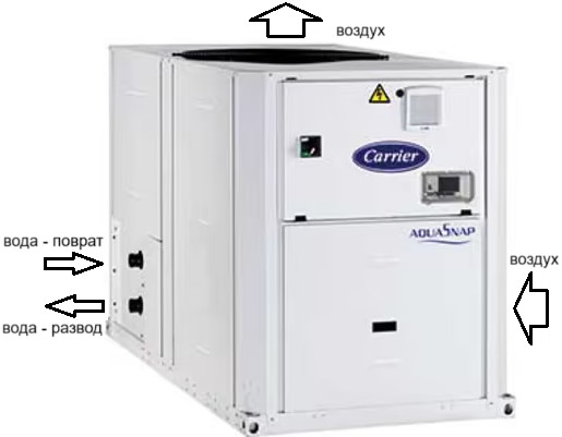 Постојат топлински пумпи воздух-вода со мали, средни и големи топлински капацитети, фабрички агрегатирани и тестирани, и приспособени за лесно инсталирање. За да имаат читателите полесна претстава ,подолу е дадена слика на една таква топлинска пумпа со топлински капацитет од неколку десетици kW.