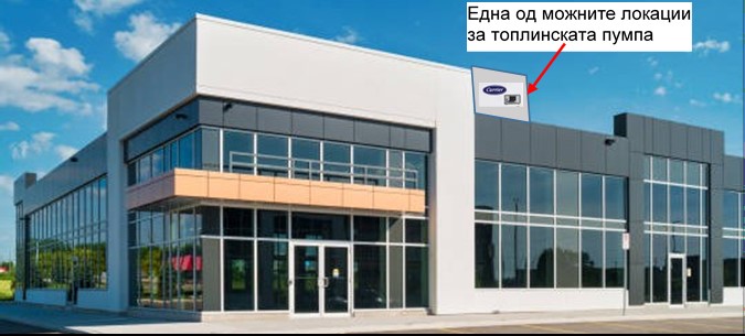 Бидејќи одзема топлина од надворешниот воздух, оваа машина треба да биде ставена надвор покрај зградата (пожелно е на дискретно место) или на покрив како што е прикажано на сликата подолу. Нема потреба од котларници, резервоари за гориво, оџаци за димни гасови, филтри за нив и др.