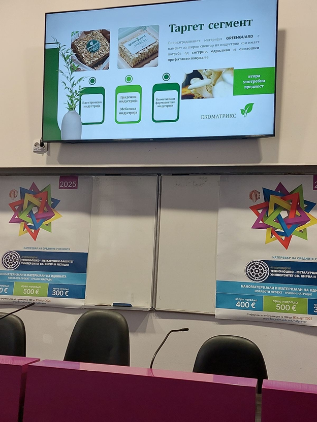 На хакатонот, одржан на 25 април, нивниот проект GREEN GUARD, нов изолационен материјал од оризов биоотпад, го освои првото место! Со идеја што комбинира екологија, технологија и иновација, тие ги освоија и жирито и публиката. Покрај паричната награда од 500€, добија и платена обука и директен контакт со индустриски лидери, чекор поблиску до реализација на својата визија.