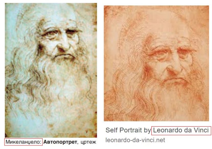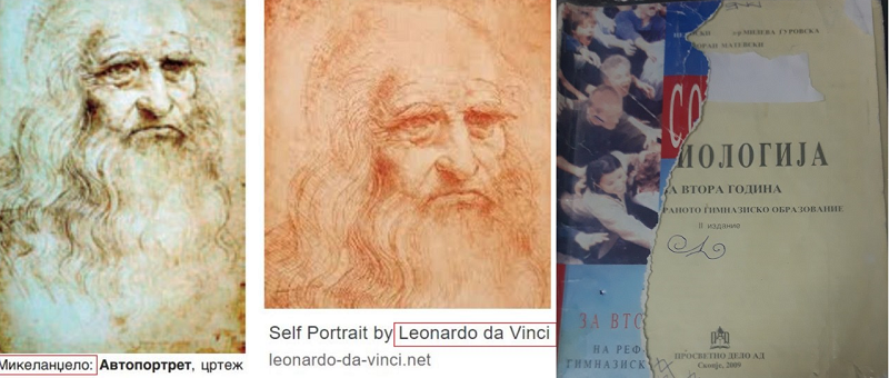 Во учебникот по ликовно автопортрет од славниот Леонардо да Винчи беше потпишан до Микеланџело, а имаше и слични грешки и низа технички пропусти.