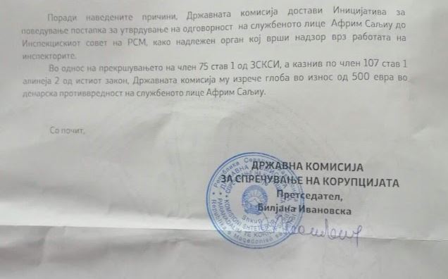 Државната комисија му изрекла и глоба во износ од 500 евра на Саљиу бидејќи го прекршил член 75 став 1 од ЗСКСИ, а казнив по член 107 став 1 од истиот закон.