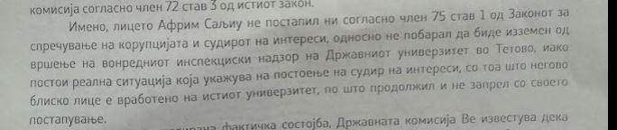 „Констатирана е состојба на судир на интереси при извршувањето на вонредниот инспекциски надзор од страна на лицето Африм Саљиу, бидејќи службеното лице имало приватен интерес што може да влијае врз непристрасното вршење на неговата службена должност, односно истото лице било должно да ги преземе сите неопходни мерки за да го спречи влијанието на неговиот приватен интерес и за тоа да го извести својот претпоставен согласно член 72, став 2 од Законот за спречување на корупцијата и судирот на интереси, а доколку се сомневало за постоење судир на интереси во конкретниот случај, лицето е должно да побара мислење од Државната комисија согласно член 72, став 3 од истиот закон“, пишува во известувањето.