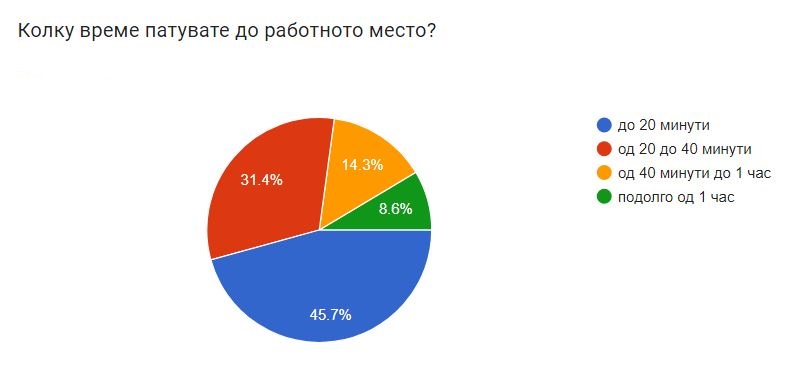 Во меѓувреме, 45,7 отсто од нашите испитаници до работното место патуваат најмногу 20 минути, 31,4% патуваат од 20 до 40 минути, 14,3% патуваат од 40 минути до 1 час, а 8,6 отсто патуваат подолго од еден час.