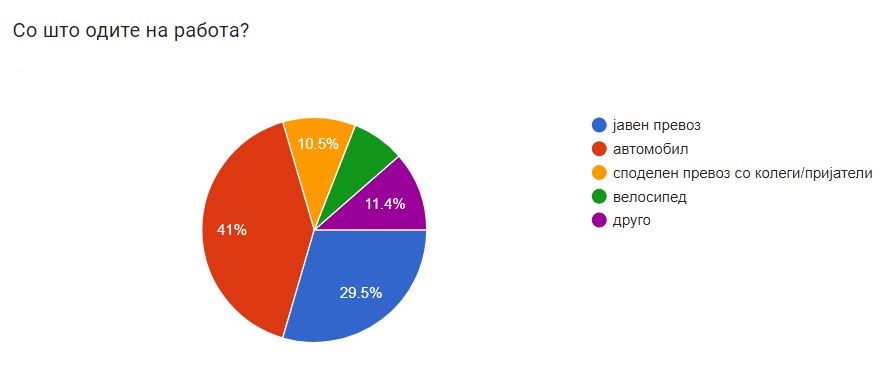 Најчесто користено превозно средство за одење и враќање од работа е автомобилот (41%), а по него следува јавниот превоз со 29,5%. Само 10,5% од испитаниците споделуваат превоз со колеги или пријатели, а 7,6% одат со велосипед на работа. 11,4 отсто од испитаниците користат други средства.