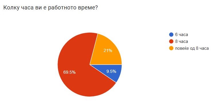 На најголем дел од испитаниците, поточно 69,5 отсто, работното време им е 8 часа, а 21 отсто се изјасниле дека работат и повеќе од 8 часа дневно. Истовремено, 9,5 отсто истакнале дека работат 6 часа дневно.