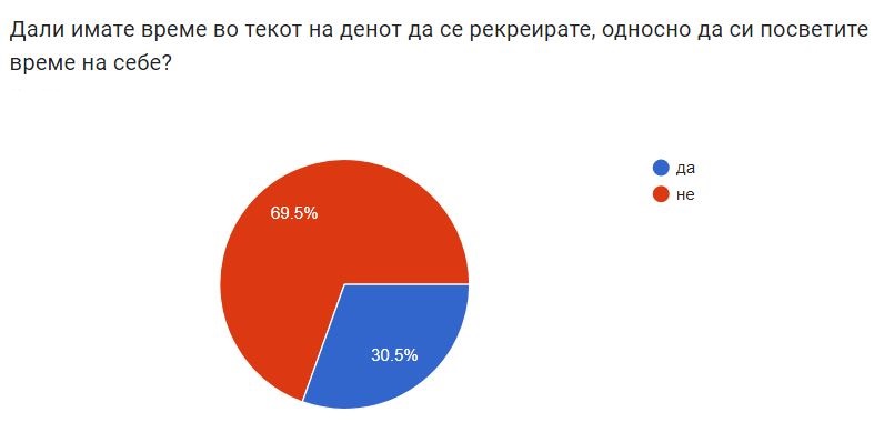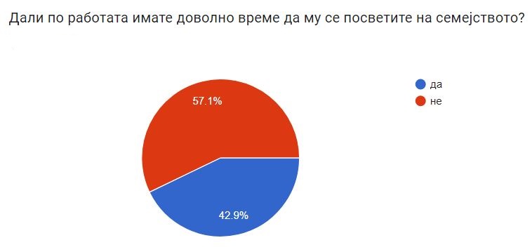Имено, 57,1 отсто од испитаниците одговориле дека по работата немаат доволно време за да му се посветат на семејството, а високи 69,5 отсто немаат време ни за себе.