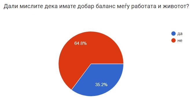 Општиот заклучок на испитаниците е дека немаат баланс меѓу работата и животот, како што одговориле 64,8 отсто од испитаниците, додека 35,2 отсто сметаат дека имаат баланс во животот. А зошто е така?