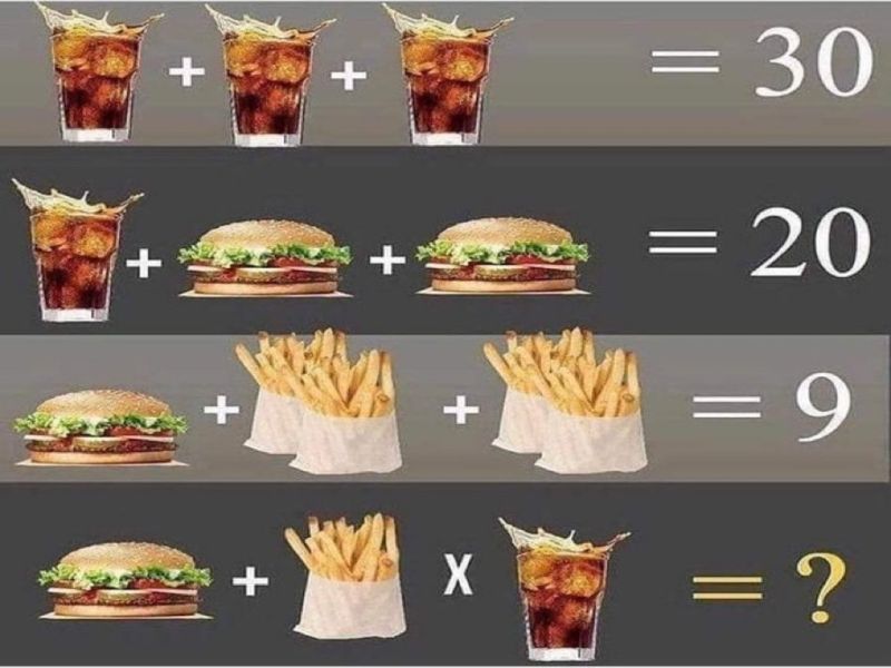 Задачата се појави на еден твитер-профил од страна на корисникот „Бенонвајн“. Задачата покажува пијалаци, хамбургер и помфрит, чија вредност е прикажана на сликата.