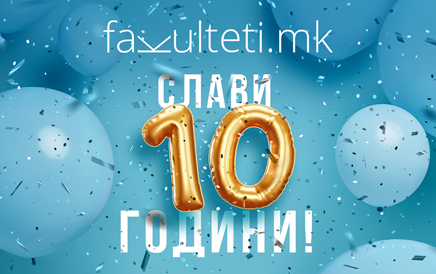 Факултети.мк денеска одбележува јубилеј - 10 години работа во дигиталниот медиумски простор. Со професионален новинарски тим и уредувачки колегиум, постојан интерактивен ангажман и над половина милион читатели месечно, се заокружува децениска посветеност на читателскиот и општествениот интерес. Објективноста, суштината и позитивните вредности беа и се водилка на ангажманот кој му доликува на сериозен и посветен медиум.