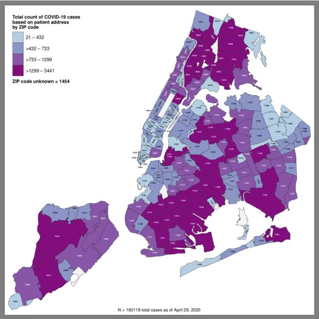 Мапа објавена од страна на градот добро ја сумира целата состојба - областите со најмногу заболени од Ковид-19 се приближно онаму каде што