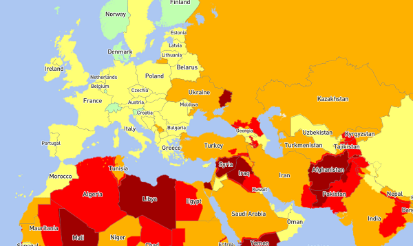 Вкупно 14 земји се екстремно ризични: Авганистан, Јемен, Сирија, Либија, Мали, Сомалија, Јужен Судан, Централноафриканска Република, заедно со делови од Нигерија, ДР Конго, Украина, Пакистан, Ирак и Египет.