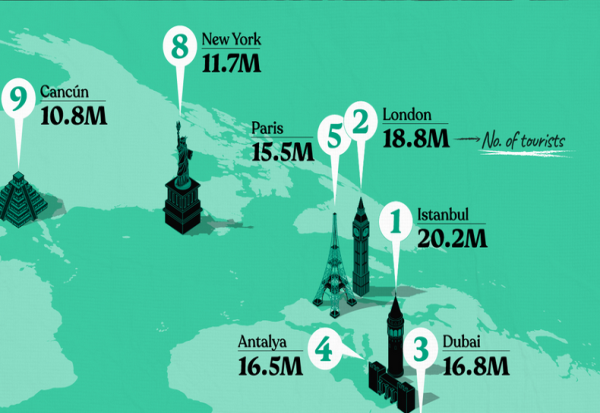 Графиконот во продолжение ги прикажува 10. најпосетувани градови за 2023 година, врз основа на вкупниот број меѓународни пристигнувања, според Индексот на топ-100 градски дестинации за 2023 година на „Јуромонитор“.