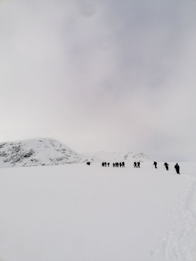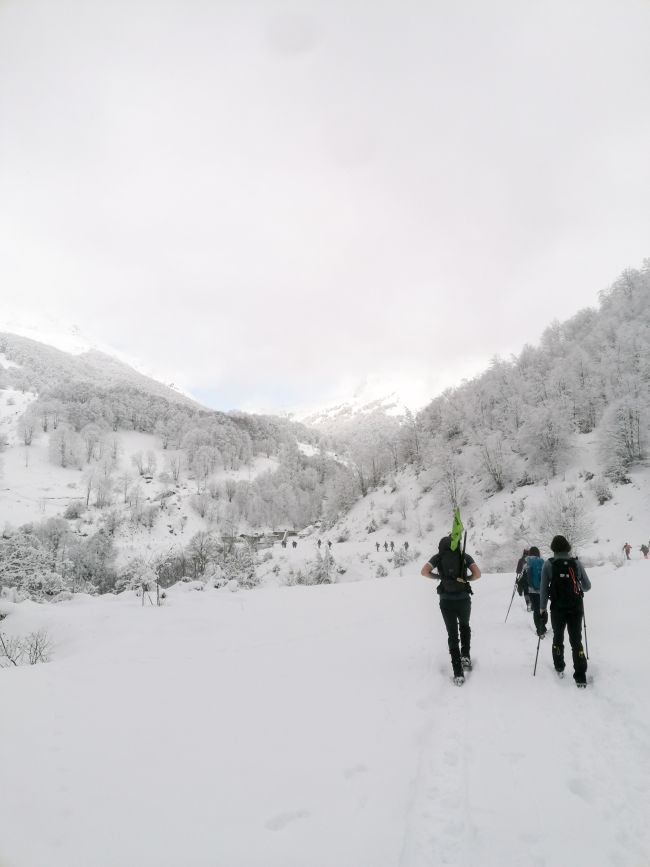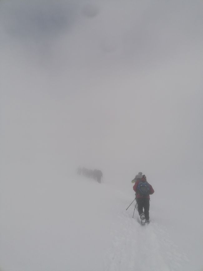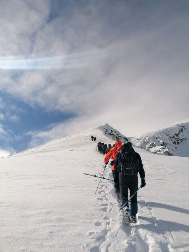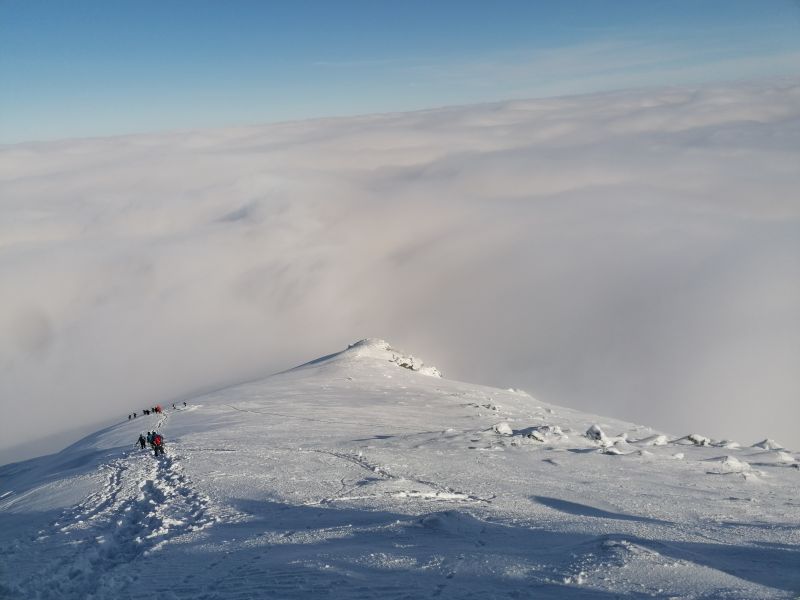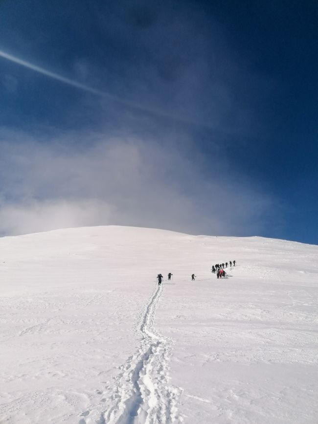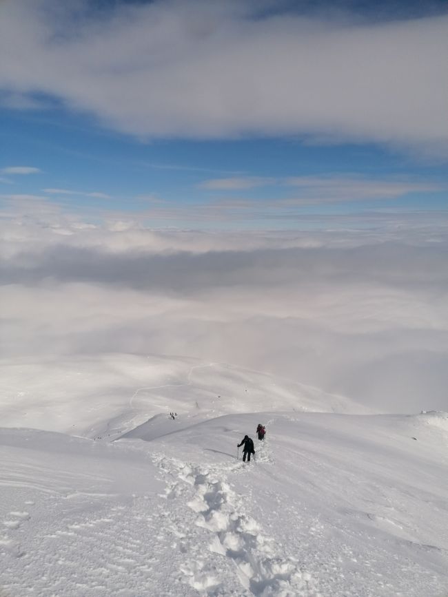 Цел пат е покриен со снег. По првите два километра водичите почнаа со пробивање и трасирање патека низ снегот. Стрмни снежни скали полека нѐ движат кон целта. Маглата се згуснува. Ни се мати погледот и ништо освен стапките пред себе не се препознава. И трае, два саати не знаеме ниту каде одиме ниту кај сме поминале. И тамам кога мотивацијата се вклучува на црвено, облак полн иње струи низ нас и бистро небо ни изгрева над главите. Пејзажот радикално се смени. Сонце нѐ огрева. Дава надеж дека можеби ќе успееме во стремежот. Енергијата се полни отпочеток. Снежните скали се уште пострмни и потешки за газење, со околу 49 степени косина според процените на водичите. Околу 80 сантиметри снег го тапкаме во веќе синхронизирана колона. Чекорот се забрзува со намера да создадеме време и да згазнеме на 2.675 метри надморска височина, ама и за да се спуштиме во селото додека не се смрачи. Небесната синевина нѐ полни со позитива и полесно одат чекорите. Следниот чекор ни е на моќниот Бориславец. Условите се супер за јануарските временски услови.